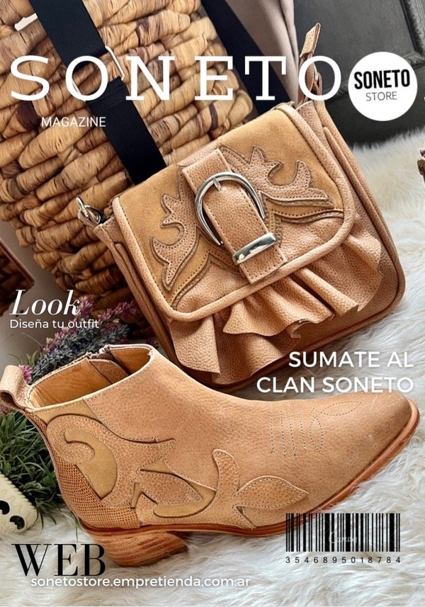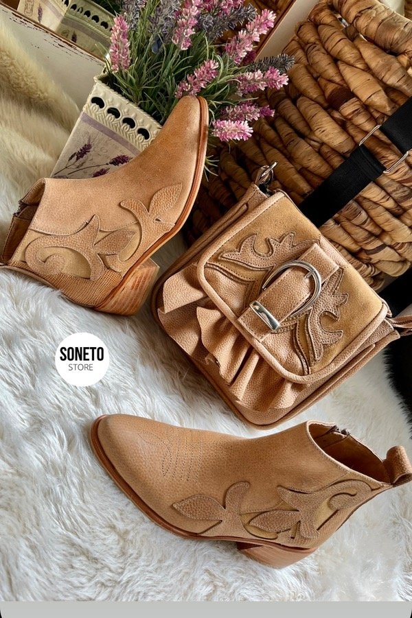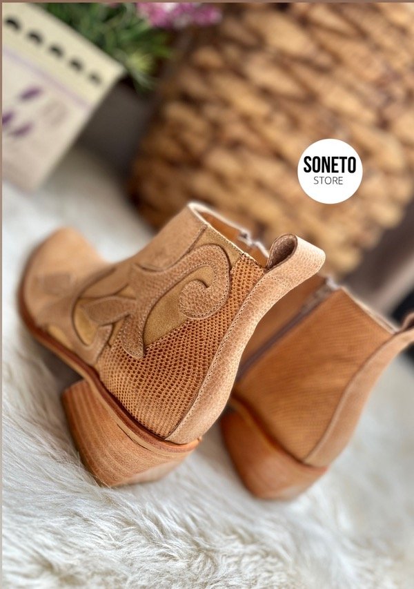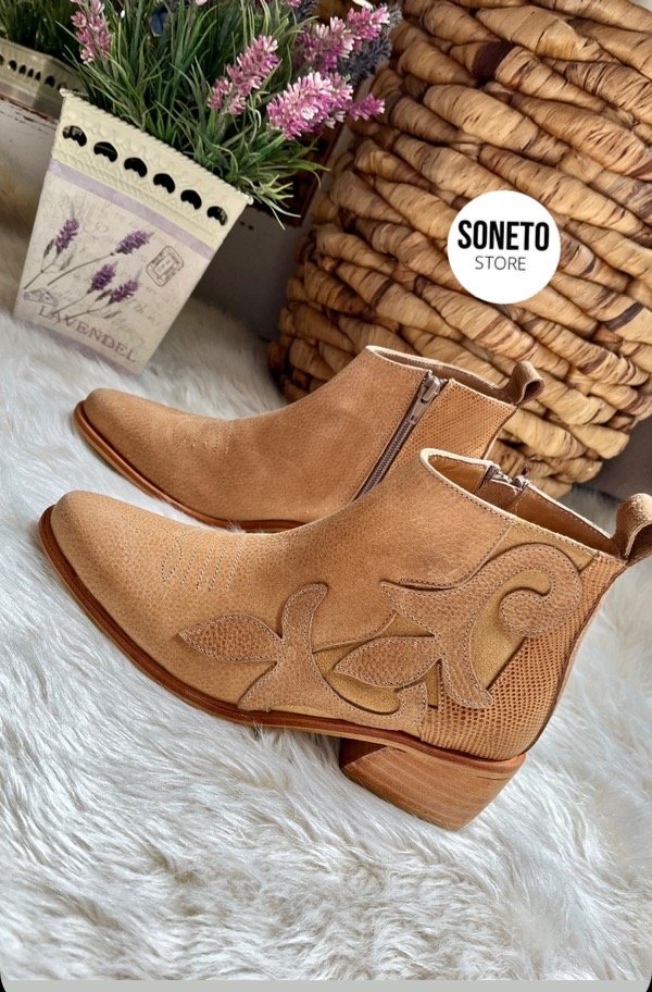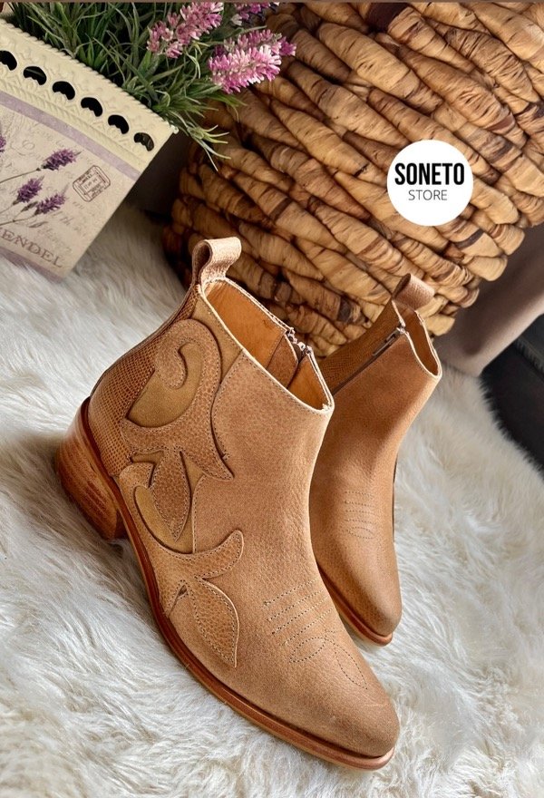 100 % cuero genuino. Con aplique en cuero al lateral. Posee cierre. Color tostadas. Caña de 11 cm. Talonera en cuero texturado.