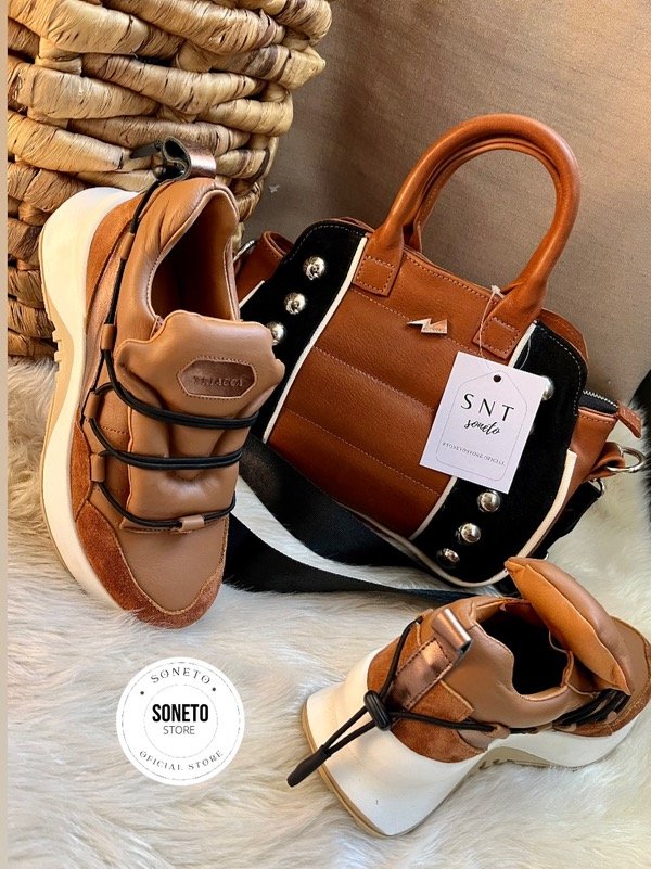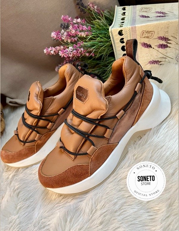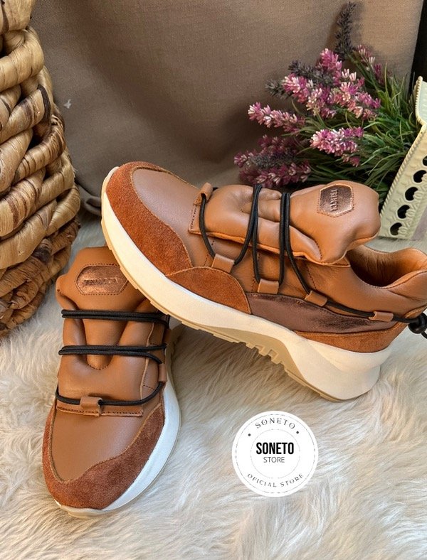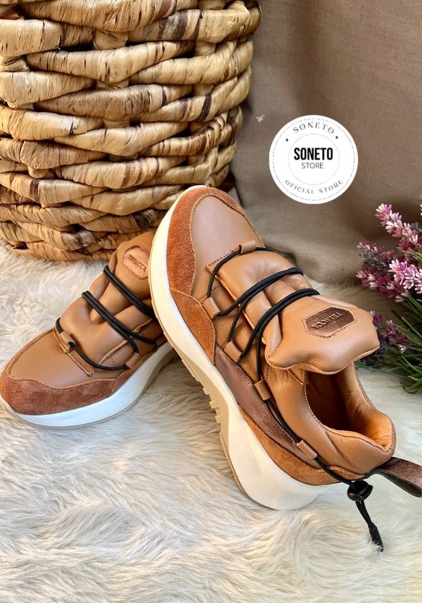 100 % cuero genuino y gamuza de primera calidad en combinación de tonos suela, óxido y bronce. No posee cordones, ajusta con elástico regulable en la parte del talón. Es súper acolchadita y en la capellada interna (debajo de la lengua) posee un elástico que permite el acceso de una forma rápida y cómoda.