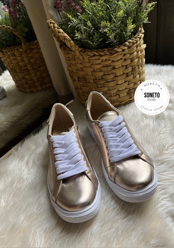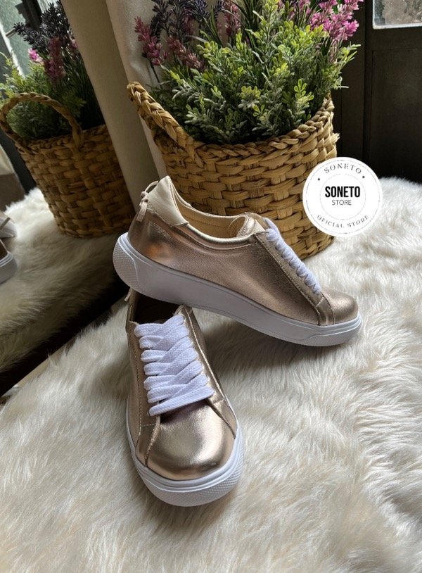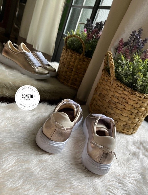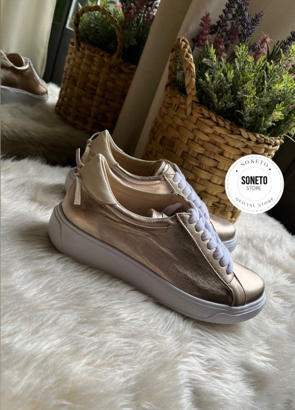 100% cuero genuino. Muy liviana. Cuero metalizado platino con toque cuero crema en talonera.