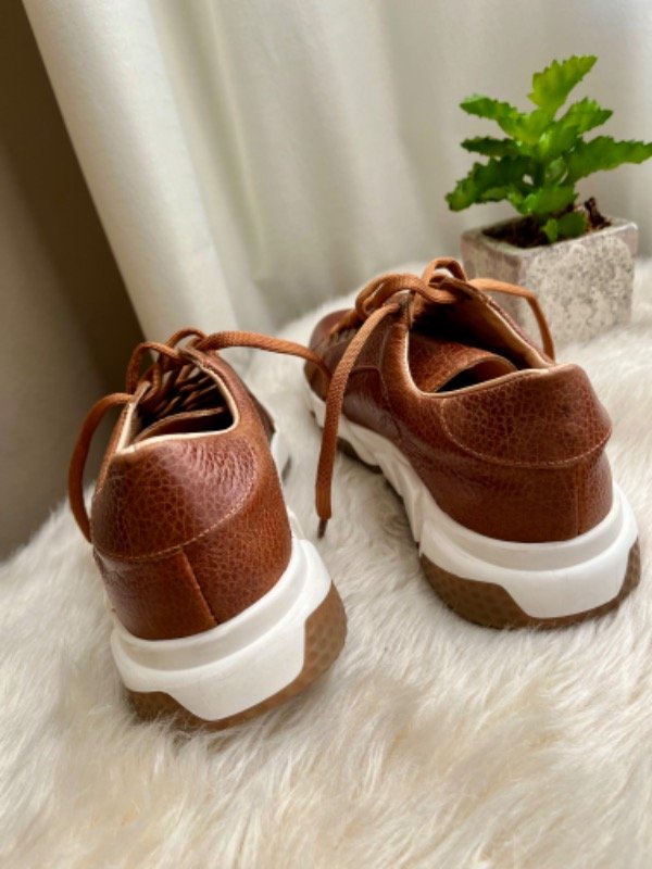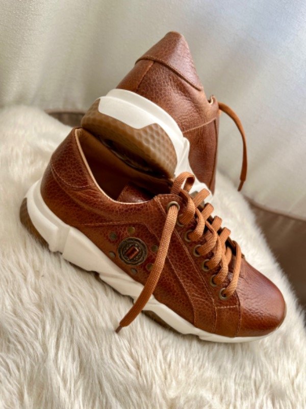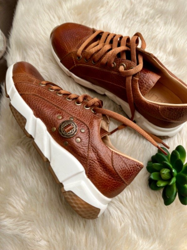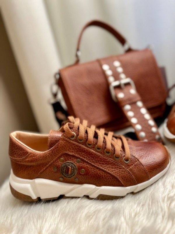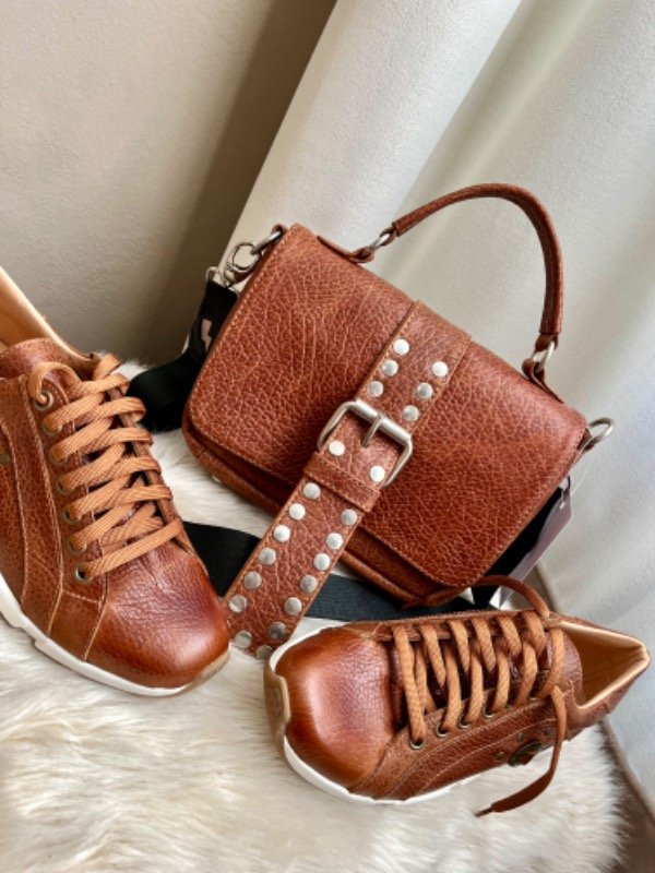 100% cuero genuino, forradas en cuero color suela. Detalle de herraje y tachas bronce en lateral.