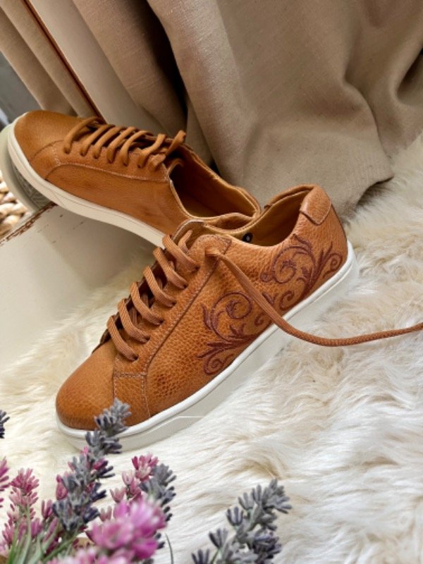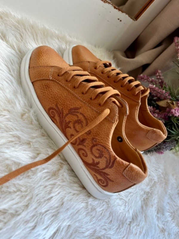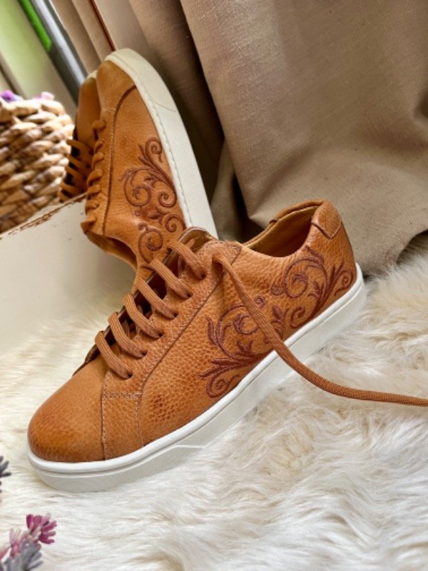 100 % cuero genuino. Color caramelo.- Bordada al tono en sus laterales externos. Base de 2,5 cm súper blandita y flexible, cocida a la capellada.