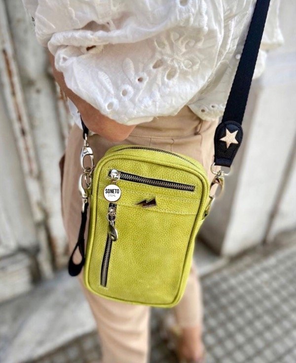 Morral de cuero, con acceso principal con cierre sin divisiones, con dos bolsillos con cierre al frente, uno por detrás.
